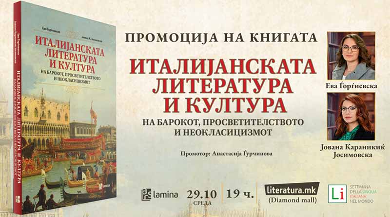 Новата книга „Италијанската литература и култура на барокот, просветителството и неокласицизмот“ од авторките проф. д-р Ева Ѓорѓиевска и проф. д-р Јована Караникиќ Јосимовска ќе биде промовирана на 29 октомври (среда), во 19 часот, во книжарницата „Литература.мк“ во „Дајмонд мол“.